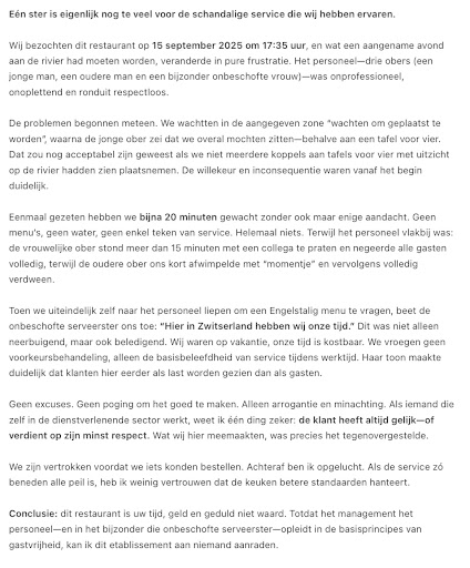 When we finally approached the staff ourselves to ask for an English menu, the rude female waiter snapped back with: “Here in Switzerland we have our time.” This was not only dismissive but insulting. We were on vacation, and our time is valuable—we were not demanding special treatment, just the basic courtesy of service during working hours. Her tone made it abundantly clear: customers were seen as an annoyance, not as guests.