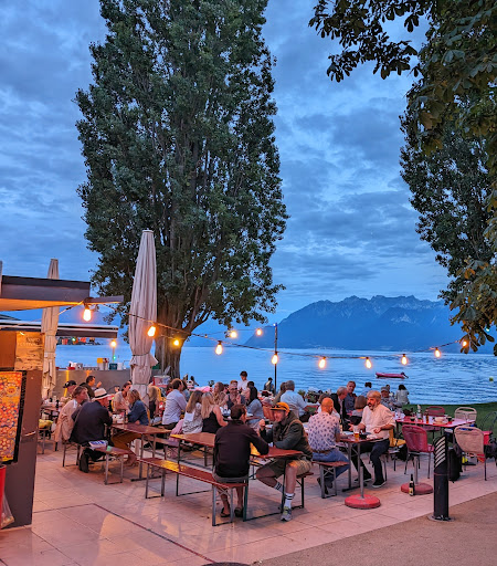 This beach restaurant (buvette) offers a great selection of meals during all summer time. Especially recommended are the grilled meats and the pizza. Wines from the region of Lavaux are available too as well as many brands of beer. You cannot reserve your table as it is self service. Nevertheless if you are patient a place will become free. Prices are moderate for the region. The view is amazing. You can see the Lavaux vineyards on the left side and the frnch alps on the opposite of the lake. Many people bring their stand up paddle to this beach because it is a good starting point for a paddle trip. The beach is stony and the water is very clear. Thete are public showers and bath rooms. The parking can get packed quickly during high season so it is recommended to come with public tranport. The bus number 85 is leaving from Lausanne...