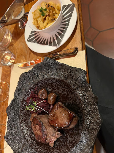 Or là, nous avons étés vraiment désagréablement surpris, en effet, lorsque les assiettes sont arrivées à table nous avons découvert quelques morceaux de viande informes sur lesquels était dressé l'os de la selle comme pour en augmenté le volume, et en guise de garniture une petite portion de spätzli, idem pour le choux rouge, 3 marrons.