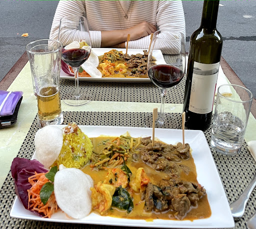 Voyage culinaire authentique en Indonésie. Avons réservé au Ratu Bali avec le passeport gourmand à la dernière minute, le patron nous a donné rendez-vous au numéro 5 de la rue du Bourg (le Ratu Bali est un peu plus haut au numéro 38), dans le restaurant indien tenu par sa femme, car il est se prête mieux aux normes Covid. Mais aucun problème à ce niveau-là , nous avons pu commander à la carte indonésienne du Ratu Bali, la situation était claire dès le départ, la salle est agréable et l'accueil sympathique. Après un apéro typique (bière Bintang et cocktail à base de fruit de la passion/liqueur de banane/vin blanc), nous avons commandé le menu dégustation à 58 CHF qui nous permet de découvrir plusieurs mets traditionnels de la cuisine indonésienne: potage vermicelles/curcuma/poulet, rouleau de printemps, assiette très bien présentée avec petites portions de riz/émincé de boeuf aux herbes/brochettes d'agneau/crevettes en sauce (photo), puis en dessert tranches de fruits/glace coco/beignets de banane....