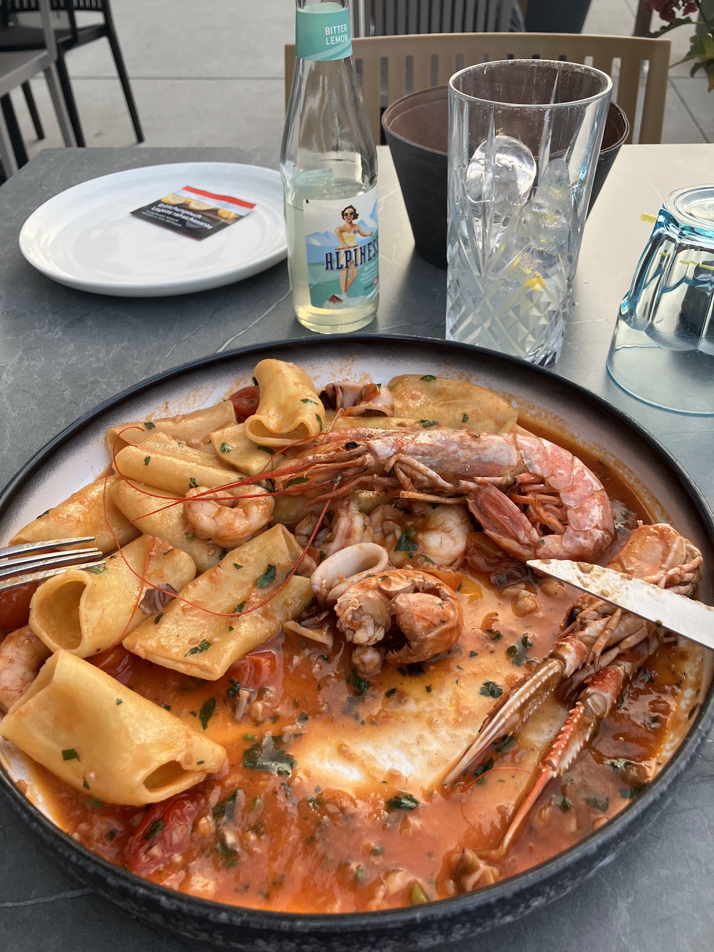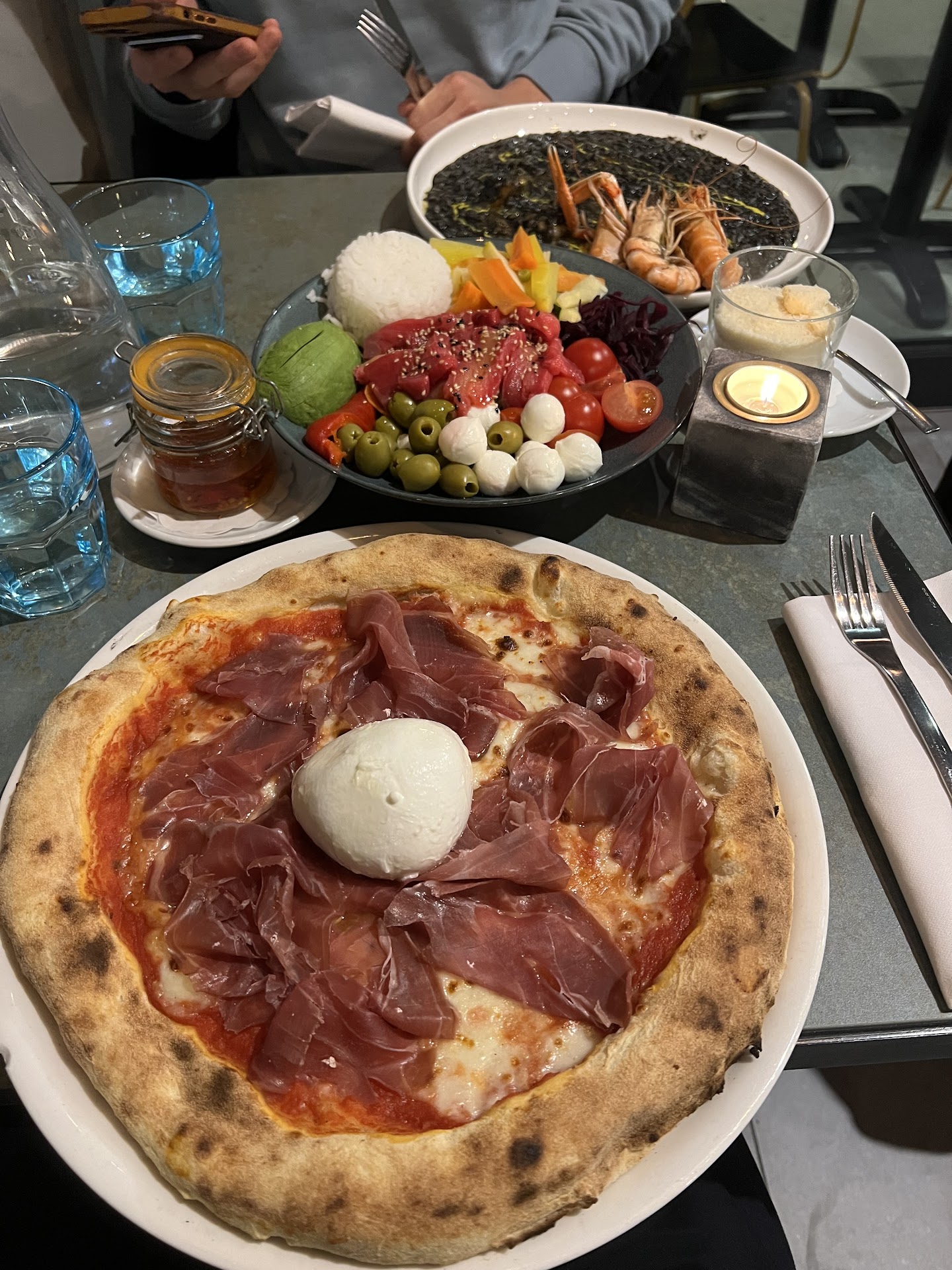 Not quite sure what other reviewers rave about (I may have an idea though). This is a pretty setting indeed but nothing to write home about it. We went two in a mid-week evening. There was no particular atmosphere. Yet it was quite noisy. Greeting and service were polite and swift but unremarkable. Not École Hôtelière by far and certainly nothing Italian (more south of France from accents). We ate with two pretty Spritz immediately served by the bar. We ordered risotto cooked "à l'americano" that was greeted with surprised eyes (that's what you get when waitresses know nothing about this business let alone Italian food) but was done accordingly and tasted as it should. Nearby tables had pizza that were quite pleasant to look at. The kitchen and pizzaiolo do a good job! Again, nothing fabulous, just the minimum to expect from the thematic name. Looks like one of these French chain affairs found a spot in Geneva. Not sure I'm convinced to eat out instead...