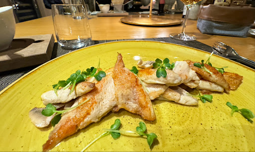 Le restaurant au rez-de-chaussée offre un intérieur sobre et élégant, avec une ambiance calme où se mêlent les murmures des verres et des voix.