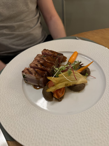 Il y a plusieurs critères sur lesquelles, en dehors du menu, je note un bon restaurant ou pas. Tout d abord nous étions venu en tout début d ouverture du restaurant et cela n a plus rien à voir. Tout d abord niveau service, nous avons attendu 25 minutes avant que l on ne nous propose un apéritif, que j' ai du demander. Par la suite pour petite information 1h20 très précisément pour pouvoir consommer notre entrée (beaucoup trop long) on sentait le service autant que les serveurs perdus, sela peut arriver mais aucun mot d excuse pour le retard... Les plats se sont plutôt bien enchaînés ensuite. Deuxième point nous avons passé le début de soirée enfumé, irrespirable de fumée du poêle extérieur à bois. Puis niveau plat rien de transcendant, je noterais une belle présentation certes mais aucune surprise culinaire, coquilles saint jacques trop cuite, les ravioles étaient bonnes mais le bouillon sans mais alors sans utilité fade les petits pois etc n avaient pas l air frais. La chasse la sauce romarin très bonne, cuisson du lièvre plutôt pas mal mais les spaetzli euuuh pas cuit, encore une fois dommage.