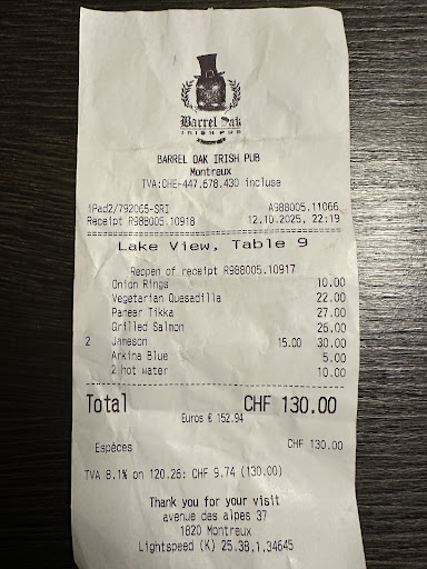 I visited Barrel Oak Irish Pub, Montreux on 12th October 2025. The food was excellent â dishes like grilled salmon, paneer tikka, and quesadilla were delicious â and the ambience was very good.