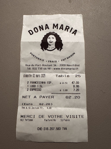 Read moreNous avons toujours apprécié ce restaurant, dernièrement nous sommes déçus de la qualité et surtout la quantité. Les prix augmentent et les quantités sont réduites. Francesinha plutôt chère avec très peu de frites (j’ai auparavant signalé ceci). Le bitoque très cher aussi selon qualité et la quantité. Dans le haut du canton, il est possible de trouver moins cher, de meilleure qualité et des frites maison (nous sommes souvent servis avec le fond du...