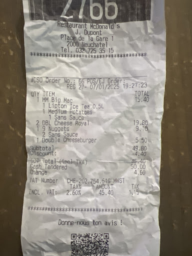 Read moreLa nourriture est plutôt bonne mais est presque toujours tiède voire froide. Le service est souvent lent. Dommage pour un fast-food. Il m’est déjà arrivé de louper mon train à cause d’un service trop lent (même en ayant plus de 25 minutes devant moi). Je suis étudiant à Neuchâtel et je m’y arrête souvent donc j’ai beaucoup expérimenté ce lieu. Le personnel est très rarement agréable et accueillant (depuis quelques temps il y a une nouvelle gérante qui gueule sur tous les clients pour un rien). Si vous voulez manger McDonald’s à Neuchâtel, privilégiez celui au centre ville (service rapide, personnel plus accueillant et nourriture meilleure et chaude). Je ne recommande pas donc pas le McDonald’s de la gare. Un changement...