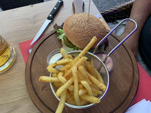 The food came out pretty quickly. I was planning to order a salad, but somehow ended up ordering a burger topped with foie gras. I was full for the rest of the day, which is probably why this combo isn’t often found on menus. That said, I enjoyed it a lot. There was a lot of vegetables inside, and the cheese was good, of course, since it is Switzerland. The french fries were really tasty too. I love when the fries taste like potatoes. Service was super fast and we were able to order and eat within 40 minutes. My burger was $32 which is quite a good price in Switzerland, especially considering the beef and foie gras in it...