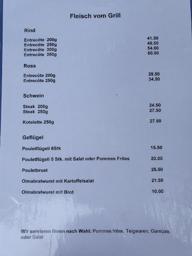 Accueil sympathique, (en allemand puis en français) et service rapide, impeccable même en fin de service de midi. La carte d'été propose une large sélection de délices culinaires traditionnel à base d'ingrédients locaux frais.