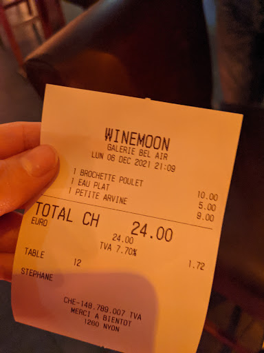 Read moreIci on est au top du top à Nyon.. fini les bistrots d’alcoolique bouseux genre sorti de match.... les meilleurs vins du monde sont représenté. Le lieu est soigné et propre avec une bonne musique d'ambiance ... comme par hasard les femmes et homme de goût l’on repérée depuis longtemps. On peut déguster des planches et des tapas de qualité voir du très bon foie gras , des huîtres au top et parfois du caviar etc etc.. il y en a pour toutes les bourses... du vin au verre de 8 chf à 20 chf et la bouteille de 29 chf jusqu’à 1800 chf pour du très grand cru. Le patron est respectueux de tous ses clients et soucieux d’apporter le meilleur.., comme par hasard il a fait de grands établissements avant la création du Winemoon. Depuis 5 ans à nyon aucun autre établissement de type Bar à vin ne lui arrive à la cheville pour celui qui recherche le raffinement et la simplicité . Ses vrais concurrents se trouvent à Geneve...