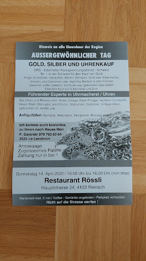 Read moreUnser freitagsclub(6pers.) war dieses mal im restaurant rössli in reinach zu gast mit einem 3 gängigen "dein deal"menue(gem.salat,frisch gemacht,200gr.rindsfilet mit ofenkartoffeln mit spargel und zum dessert selber gemachtem vanille pudding) voll ins schwarze getroffen,dass zu fr. 69 - für 2 pers.angeboten wurde. Das familien geführte restaurant hat vom sehr netten und aufmerksamer bedienung bis zum gratis offeriertem limoncello überzeugt. Dieses restaurant ist zu empfehlen,alles frisch und schmackhaft...