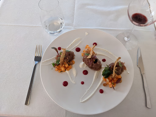 Das wurde uns serviert: 4 kleine Stücke Spargel mit 1 Eigelb 1 (!) Tortellini mit Parmesan-Sauce, ein sehr einfaches italienisches Gericht 4 (!) Stück Rigatoni mit Ragù, ebenfalls simpel und unspektakulär Ein völlig übergartes Stück Lamm mit einer überwältigenden Senfkruste und einem winzigen, geschmacklosen 1x1 cm Kartoffelgratin Eine dünne, 1 cm kleine Scheibe Schokoladenkuchen mit Himbeer-Sorbet