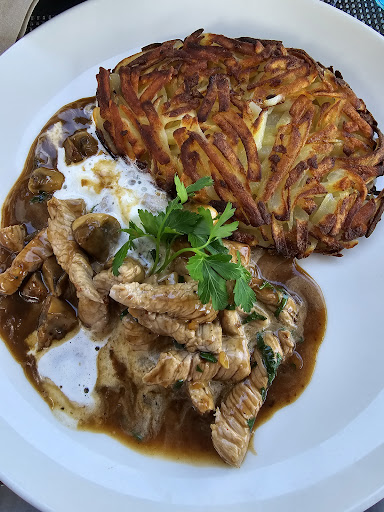 Als Hauptspeise Hacktäschli mit Kartoffelstock. Sowohl die Hacktäschli wie auch der Kartoffelstock überzeugten in Geschmack und Haptik. Was nicht überzeugte waren die für die Optik der new Cousine benötigte getrocknete Rotkohl Scheibe, in den Kartoffelstock gesteckt. Fade trocken und nicht frisch, zerstört dieses optische Detail den Gesamteindruck des Rasens.