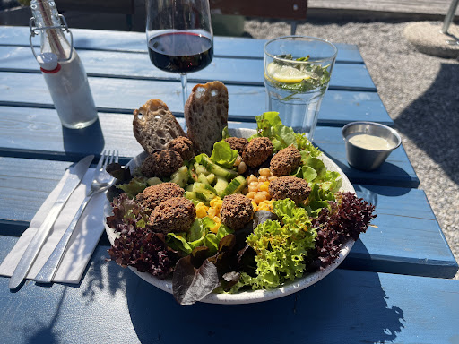 Ich habe eine Salatbowl mit Falafel genossen – sie hat mir ausgezeichnet geschmeckt. Ein Gläschen Rotwein rundete das Erlebnis perfekt ab.