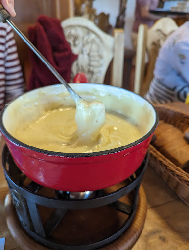 Read moreWe were greeted by a very friendly staff. Luckily we arrived early and were able to eat before the restaurant was entirely booked for the evening. A reservation for dinner is required as the restaurant is completely booked every evening. The restaurant is famous for its cheese beignets, which we did not try. After a beautiful hike from Sainte-Croix we wanted a fondue. The fondue was too mild for our taste and lacked garlic, nutmeg and kirsch. Prices...