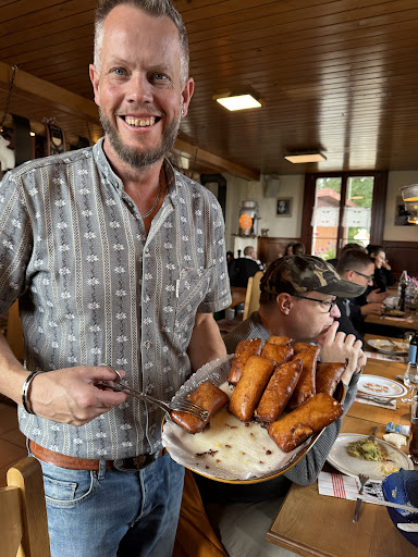 After 33 years, we were finally able to return to one of the most memorable experiences we have ever had. Up the mountain, along a thrilling windy road, through the woods, to a little farm outside of St. Croix , is a little bit of heaven. A farm that started making Cheese Beignets years ago, that has evolved into a wonderful little chalet café. You are immersed in a warm, cozy, relaxing environment, surrounded by the farm and filled with authentic Swiss cow bells. The Cheese Beignets are hot, light, and amazingly full of flavor. They serve you until you can't eat anymore. I had a nice amber Swiss beer and my wife had local red wine. And don't miss the short hike up the rest of the hill where a viewpoint is perched on a cliff overlooking the Swiss countryside, including Lake Neuchatel and Lake...