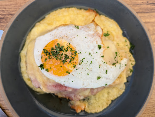 The menu displays some originality and pushes the limit of the standard alpage fare. A clear example of this creativity is a menu item called "Les sardines qui ont perdu le nord". Our dishes were nicely presented but we're a bit short on the execution, e.g. the home made rösti was undercooked and the croûte au fromage used a bread that more closely resembled "Wonder Bread" than what one would expect bread to be in a rustic setting.