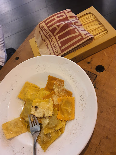 ●!!!Wenn Ravioli dann von Pastarazzi!!! Hammer Variationen! ●Auch die selbstgemachte Pasta ist superlecker!!! ●Nebst den eigenen Pastaprodukten und der schön hergerichteten und vielfältigen Ravioli und Antipasti-Auslage gibt es auch Momos,Lasagne,Frühlingsrollen, Capuns...u.v.m. von Hand und mit liebe gemachte Produkte...frei von künstlichen Zusätzen,....von Menschen gemacht, welche ihr Handwerk aus diesen Regionen echt im Griff haben. ●die schön hergerichteten Geschenkkörbe sind immer ein gelungenes Present, ob als Mitbringsel oder als grosses Geschenk👌🏼 ●...IMMER eine mega freundliche Bedienung...egal wie voll der Laden ist, die Herren sind immer total entspannt und verbreiten gute Laune... DANKE für diesen...