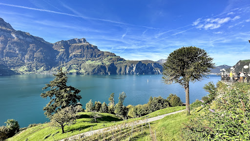 The restaurant has a special location that offers a breathtaking view of Lake Lucerne. It is the perfect place to stop for a refreshment while passing through from the south to the north of Switzerland and enjoy the mountain-lake scenery.