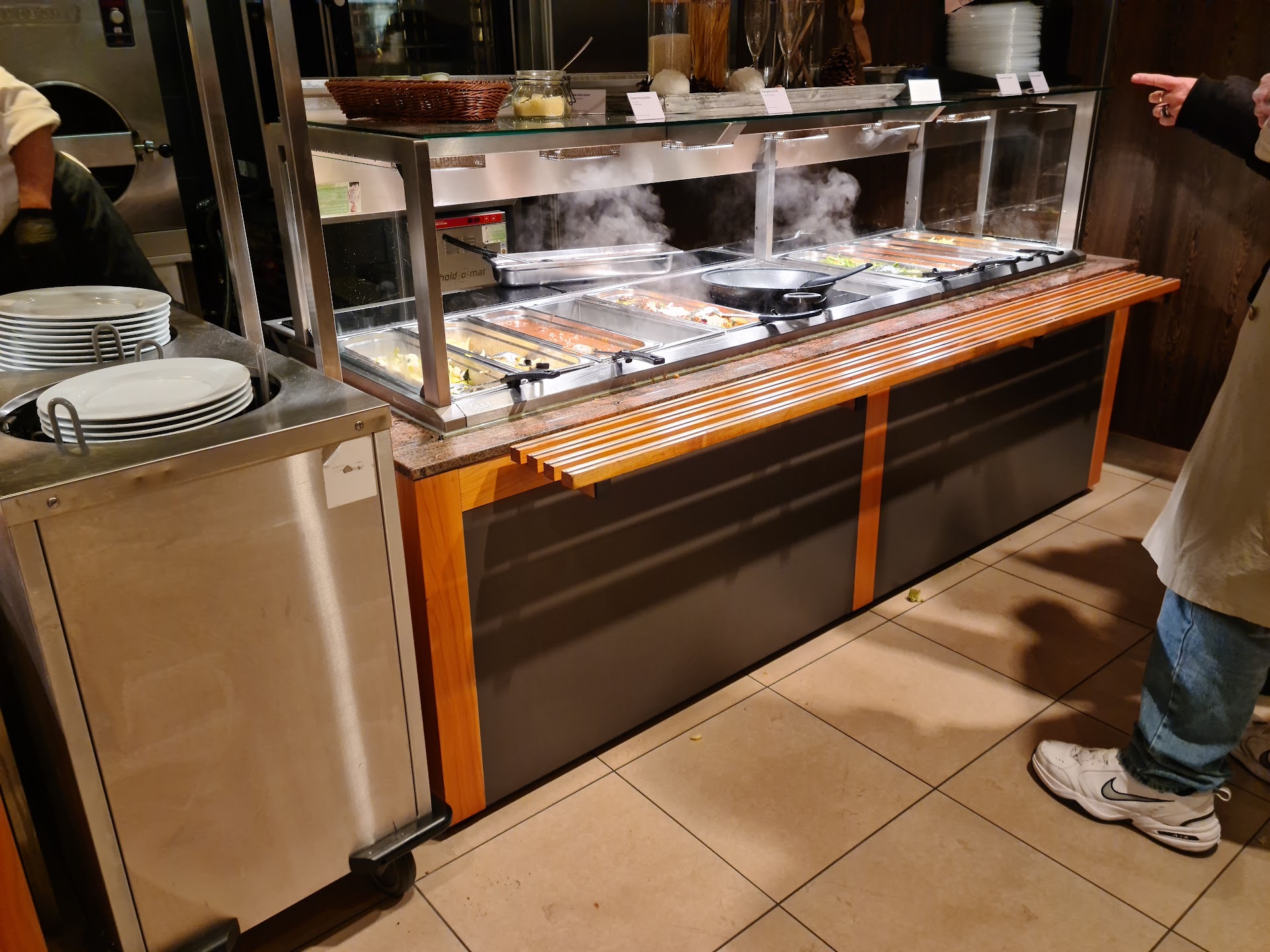 Hoppla.Ein anderer Herr stand neben mir, sogar er sah ganz erschrocken aus. Weil ich Hunger hatte, habe ich halt "bitte gewartet" bis eine Dame kam, die ich darauf angesprochen habe, was gerade eben passiert ist, weil sie ihren Kollegen gerade eben sehr wohl gehört hat. Auf meine Überraschung wurde ich von ihr nochmals belehrt, nochmals mehr unfreundlicher. Man sollte das Schöpfbesteck beachten, in welche Richtung die Kellen zeigen, und so weisst man, ob es gerade Selbsbedienung ist oder nicht.(Angeblich Samstags ist es.) Wow, hätte man ja selber wissen können, oder?!Vor allem wenn man zum ersten Mal hier ist?!-habe ich aber nur gedacht, weil ich ein Gespräch mit ihr auf diesem Niveau schon gar nicht (weiter)führen wollte. Zum Schluss, sagt noch die Dame ZU MIR in einem ziemlich scharfen Ton: "Man kann aber miteinander reden!" Also-sorry für die Ausdrucksweise, aber: geht's noch?