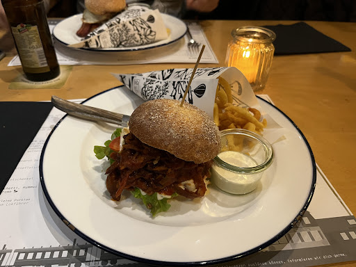 wurden ziemlich lange vom Service ignoriert, alle um uns rum wurden bedient, wir konnten erst bestellen als ich nachgefragt hatte. wir konnten nur aus einem kleinen Teil, der eh schon übersichtlichen Karte bestellen, mit der Begründung, das es spät sei und was lange dauere nicht mehr bestellt werden kann. Ich denke Pulled Pork macht man ja im voraus, das kann man nicht machen wenn der Gast bestellt, daher ist diese Begründung nicht wirklich nachvollziehbar. Vermutlich hatten sie keines mehr. Der Burger der noch bestellt werden konnte war nicht wirklich toll, und für den Preis doch eher klein geraten. Die Pommes waren hingegen sehr gut, originell gemacht und die Saucen top. Damit hat das Bahnhöfli wieder einen Stern gutgemacht. Trotzdem war unser Fazit, wir wären besser woanders hin...