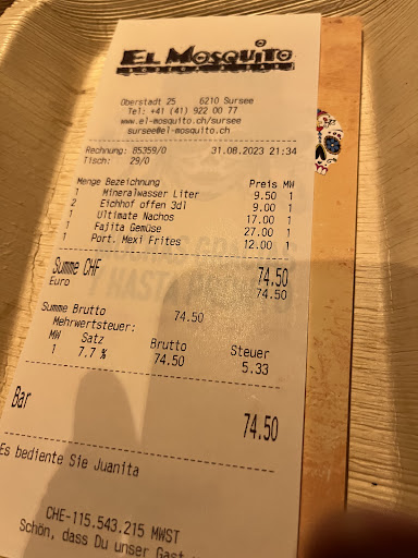Read moreEl Mosquito is our favourite tex-mex in Switzerland. Love coming back to the cute old town of sursee to enjoy their friendly service, giant menu of delicious food. They also have amazing drinks but I come here for the food! In our latest visit, We arrived in a sunday afternoon with no reservation, the attendant was quick to arrange us a table in the middle of the room but told us 'if you dont like it you are welcome to have a drink at the counter until a table frees up.' That already won me over! Noting we were just coming back from a weekend in Vevey, Vaud, where they dont even bother speaking with you ...they just place a sign: sorry, we are fully booked....ugh so irritating. Anyway, Mosquito in Sursee....had a delicious passion fruit ice tea with real passion fruit! A treat! Husband had a virgin strawberry daiquiri which was a fresh dessert on its own. Juicy hamburger cooked to perrction and nachos con chili con carne came fast and were delicious. Will always come back! Next time i will definetly make sure to take photos of the food😍😍 forgot to mention: why only 4 stars for Atmosphere? Smokers are standing in front of the entrance door in rainy days smoking their heart out and blowing smoke inside the restaurant. Smells like a smokers bar.😶 Urgently need to build an outer structure for people to smoke far away...