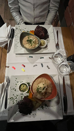 Read moreBereits beim Reinkommen ist uns die unangenehm laute und unpassende Musik aufgefallen. Die Bedienung hat uns danach kurz mit einer schnippischen Handbewegung gezeigt, wo für uns reserviert war. Die Vorspeise war in Ordnung, das Mineralwasser war leider auf Zimmertemperatur. Der Hauptgang (1x Dry Age Entrecote, 1x Rindsfilet beides Medium bestellt) wurde innen komplett roh serviert, dass in einem Steakhouse ! Das Fleisch wurde nachgebraten hatte danach jedoch einen Geschmack nach Gas und war aussen schwarz verbrannt. Der Risotto und die Pommes wurden nicht neu gemacht und waren nur noch lauwarm ! Das Dessert wurde 15min lang auf der Theke stehen gelassen, weshalb die Glace bereits zur Hälfte geschmolzen war. Auf unsere Beschwerde hin wurde uns ein gratis Kaffee angeboten, sonst NICHTS ! Nie...