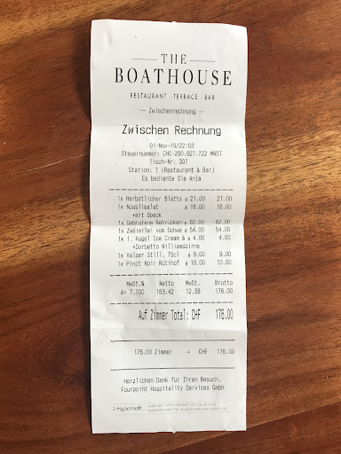 The outside of the hotel Alex is gorgeous, aesthetically pleasing and such a nice location on the lake. We booked a table for 2 at 20:15 last night and had specified it was our Anniversary. When we arrived, we were greeted by a friendly car valet, a highlight! We entered and had a hard time to find someone to greet us, the host stand was not at the front door and no one was there. The place was not busy, which was interesting for a Friday night, but they are still quite new. The decor looked very dated, but I that is the style they were going for a bit 70âs retro yacht club. We sat by the window and first glance at the menu we were pleased. They started us with an amuse-bouche, which was yummy. But, when our starters arrived, I couldnât believe the display. We had ordered the Herbstlicher Blattsalat (as recommended by the server) and the NĂŒsslisalat. The HB looked like someone dropped it on the floor and scooped it up before bringing it to the table. I took one bite and that was it. The duck liver was NOT fried as mentioned it the menu. You would imagine a nice seared outside and smooth insides. Instead it appeared to be boiled, cover up its horrendous unappetizing state in apples bits, was full of sinew and tasted awful. I love liver and was incredible turned off. My empathetic husband changed plates, but he too couldnât eat it. He said it tasted off, which it could have been. The NĂŒsslisalat was ok, the cold decorative bacon strip looked and tasted like it was cooked yesterday, but the egg was nicely done, with a crispy exterior. We wanted to have the HB removed as we both were not going to eat it, but we couldnât get the attention of our server. She kept on serving other tables around us, without making eye contact. There was no enjoyment check up. We finally flagged down another waiter and explained we both did not like the salad as it was inedible and sent it back with only a few bites removed. I promise you this is the first time we have EVER sent back a meal. Our server acknowledged we did not enjoy the first course and gave an apology but didnât offer us an alternative. We moved on. It seemed to take forever for food dishes and wait staff were not very attentive in general, which was surprising as it was not busy at all. Our main course came, we ordered Combination of Pork: Braised Pork cheek, Crispy Pork Belly, Celery and Parsley Mash and the Pan Fried Venison Medaillons with an Herb Crust, Bacon Brussels Sprouts, âSpĂ€tzliâ, Cranberry-Pepper Jus. The pork was child-like plated and was over cooked, tough, and not quite âcrispyâ pork belly. The mash was delicious. The venisonâs presentation again looked a bit rough. But the sprouts, spĂ€tzle and jus tasted great. The three version medallions weren't cooked consistently and more like herb dusted, not âcrustedâ. Both were disappointments for meals that cost CHF54 & 62! Server did not once check up on us, to see if we liked the second course. Attentiveness would be the biggest thing they lacked. The dessert menu is sparse, three selections and ice cream/sorbet. I decided to skip, but for the occasion my husband got the Williamâs Pear sorbet. Tasted like frozen gum, yet another fail. We asked for the check. On top of it, not once did anyone acknowledge our Wedding Anniversary. Why ask if you have a âspecial occasionâ during the reservation if they clearly donât care? I wasnât expecting a free glass of champagne but a simple 'Happy Anniversary' would have been nice. The bill CHF176: 2 starters (they charged us for the HB salad CHF21, that we did not eat), 2 mains, 1 water, 1 glass of wine, and sorbet). No manager came to speak to us about the meal, nothing was taken off our bill, they really didnât care. We paid, did not want to make a fuss, as it was our Anniversary and we enjoyed each others' company greatly. The Boathouse was a complete disappointment. We will not go back, to eat and will not recommend to our guests, family or friends. Again, the valet guy greeted us warmly on the exit and was genuinely a lovely end that left a bad taste in our...