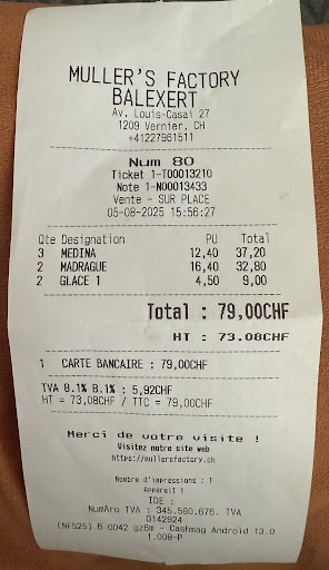 Nous comprenons que le service peut être stressant, mais un peu de convivialité et de professionnalisme sont essentiels, surtout dans un lieu familial. Nous avons commandé 3 crêpes médina puis 2 Madragues et 2 glaces. Dommage, car les crêpes elles mêmes étaient délicieuse, mais le service a vraiment laissé à désirer. J’ai pour habitude de prendre des crêpes à Muller’s Factory cependant vaudrait revoir l’accueil avec cette dame aux cheveux courts roux. Nous espérons qu’il s’agit d’un incident isolé et que l’équipe pourra améliorer son...