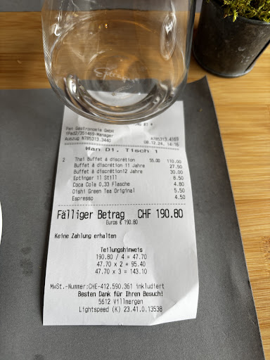 Das Restaurant befindet sich in Wohlen, nicht in Zürich. Da es nicht im Stadtzentrum liegt, sollte sich der Mietpreis nicht im Preis der Gerichte widerspiegeln. Das Restaurant befindet sich nicht einmal in Wohlen, sondern in Villmergen. Weder die Dekoration, noch die Größe des Restaurants, noch die Anordnung, noch der Professionalismus des Service lassen darauf schließen, dass wir in einem gehobenen Restaurant sind. Der Raum ist begrenzt, insbesondere hinter der Eingangstür, wo man direkt in die Buffetgerichte fallen kann.
