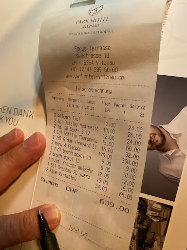 Read moreWe lucked out in getting the last available table in this incredible Michelin-starred restaurant in a beautiful hotel (Park Hotel Vitznau) with a unique view over Lake Lucerne. Menu was vegetarian with optional meat/ seafood upgrades. Exceptionally good. Service was fantastic. Wine list was incredible. Easily can spend 200-300 chf per person depending on wine choices. Incredibly good and best restaurant we have been to in Switzerland in the...
