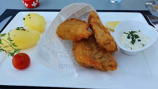 We continued our odyssé of restaurants in the harbors of Swiss lakes, today on Lake Murten, south of and in connection with Lake Neuchâtel. We opted for fish and had the choice between filets of perch, either from Lake Murten or some unknown Polish lake. We chose the former, rather expensive for a small portion, and you had to pay extra if you wanted French fries in stead of boiled potatoes. The perch was fine and the reception cordial. There are local wines from Vully to be had by the glass. Not particularly good value for money if you compare with restaurants around Lake Neuchâtel serving locally...