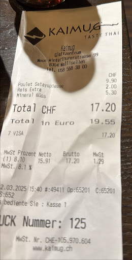 Read moreIâve been a loyal customer of Kaimug at Glattzentrum for years, picking up my weekly Pad Thai takeaway. It used to be unbeatable compared to the other locations in Zurich. However, over the past two months, something seems to have changed. The portion sizes feel smaller, the âspicyâ option isnât spicy anymore, and theyâve even forgotten the peanuts a couple of times. Iâd greatly appreciate it if management could look into this and ensure the quality matches the high standard Iâve come to expect. Iâll gladly update my review once things...
