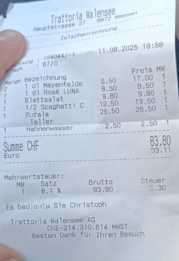 Read moreDas Motto auf der Website: "Mit Herzlichkeit und Handwerkskunst werden Sie von einem ambitionierten Team nach den unauflöslichen Regeln der guten italienischen Küche und echter Gastfreundschaft verwöhnt" - dieser Slogan wird vom Chef ganz und gar nicht vorgelebt...||||Unsere Familie war kürzlich in der Region Walensee wandern. Spontan entschieden wir uns für eine Pizzaessen am Abend, da wir sehr hungrig waren und den langen Heimweg mit dem Auto nach dem Essen in Angriff nehmen wollten. Die Suche fiel auf die Trattoria in Weesen. Ich rief kurz an und fragte den Chef, ob wir zu 5 einen Tisch reservieren könnten. Er meinte zuerst, dass wir erst ab 20.30 Uhr kommen könnten, weshalb ich ihm mitteilte, dass dies für uns zu spät sei. Danach sagte er, dass wir doch früher kommen sollten "er könnte uns schon noch irgendwo reinquetschen" - das waren seine Worte! Bei diesem Satz war ich schon das 1. Mal etwas irritiert. ||||Als wir ankamen, sahen wir unseren reservierten Tisch - Freude herrschte, wir haben einen Tisch! Nachdem wir längere Zeit (mit sehr knurrendem Wandermagen) auf fehlende Bedienung gewartet haben, sprachen wir eine Serviceangestellte an - wie gerne hätten wir schon mal ein Getränk bestellt. Anscheinend nimmt nur der Chef die Bestellung auf (hatte ein Gerät bei sich, um es direkt zu erfassen). Obwohl er uns gesehen hat, bediente er x Male andere Gäste vor uns. Gäste, die nach uns gekommen sind oder wartende Gäste, welche zahlen wollten. Als mein Mann kurz die Hand erhoben hat, um ihm ein Zeichen zu geben, dass wir gerne bedient wären, hat er uns weiterhin ignoriert. Als er dann doch endlich zu uns gekommen ist - ohne ein Grüezi, Hallo oder so - meinte er mürrisch, dass er nicht überall sein kann. Wir und unsere Kinder mussten uns sehr zurückhalten, dass wir nicht reklamierten. Wir vermuteten, dass wir dann erst recht nicht bedient werden oder noch länger warten müssten, als unsere Nerven schon strapaziert wurden. ||||Das Essen war akzeptabel, aber nicht speziell. 1 Menü wurde uns falsch serviert, dies hätte an einem anderen Tisch gebracht werden sollen. ||||Wie schade, dass ein Chef ein so schlechtes Vorbild ist für seine Crew. Wie schade, wenn der Gast merkt, dass das Team nicht harmoniert und ohne Leidenschaft bedient wird. Wie schade, dass der Kunde sich nicht wohl fühlt, obwohl die Lage so Nahe am See toll wäre . Wie schön wäre es, mit einem Lächeln begrüsst zu werden, anstatt eines kalten Anblicks. ||||Mit Wehmut denken wir an unseren Sommerurlaub im Zillertal im Tirol zurück - dort erlebten wir einmal mehr, wie der Kunde geschätzt wird (Kunden = Lohn & Freude!), mit Herzlichkeit bedient, das Servicepersonal ist motiviert, kundenorientiert und freundlich. ||||Hatten unsere Schweizer Restaurants nicht gerade sehr schwierige Zeiten hinter sich wegen Corona und ist für jeden eingenommenen Franken froh? Die einen haben dies entweder nicht nötig oder merken ihr Fehlverhalten erst, wenn es zu spät ist und das Restaurant geschlossen werden muss. Schade, sehr...