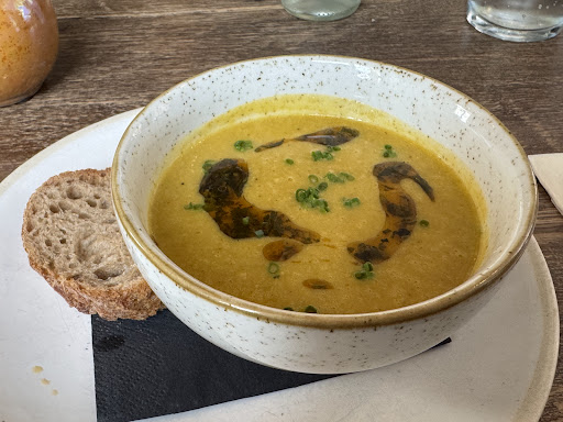 Noch während wir an der Vorspeise waren, kam ein Herr (vermutlich der Geschäftsführer) an unseren Tisch und fragte, ob es in Ordnung sei, unseren Burger bereits zu bringen, da die Küche etwas schneller war. Wir lehnten höflich ab, da wir unser Essen gerne ohne Zeitdruck genießen wollten.