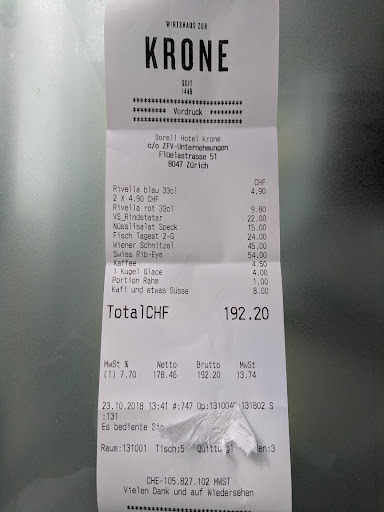Read moreWir waren in Winterthur unterwegs und wollten knapp vor 14 Uhr etwas essen. Bei einigen Restaurants wurden wir abgewiesen. Nach 13.30 Uhr keine Mittagessen mehr. Wir sahen die Menutafel vor der Krone die einladen tönte. Wir gingen hinein und fragten ob Mittagessen (13.50 Uhr) noch möglich sei. Ja wir mĂŒssten aber gerade bestellen. Kein Problem. Meine Frau Eglifillet mit KĂŒrbis-Risotto, ich Spaghetti Milanese. Die nette Kellnerin brachte uns an einen Fenstertisch im 2. Raum, da der effektive Raum fĂŒr Mittagessen fĂŒr ein grösseres Banquet vorbereitet werden musste. Super Platz. Das Essen mit Suppe oder Salat vorab. Super aufbereitet, sehr schmackhaft. Wer QualtĂ€t zu eunem fairen Preis will ist in der Krone absolut richtig. Nochmals ganz â„ïž Dank fĂŒr den top Service und auch an die Mannschaft in der KĂŒche fĂŒr ihren Einsatz und das excellente...