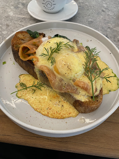 The sourdough and salmon breakfast was divine. The poached eggs were cooked to perfection, boasting incredible softness. The smoked salmon was bursting with flavor, and the generous, untoasted slice of sourdough was a delightful surprise.