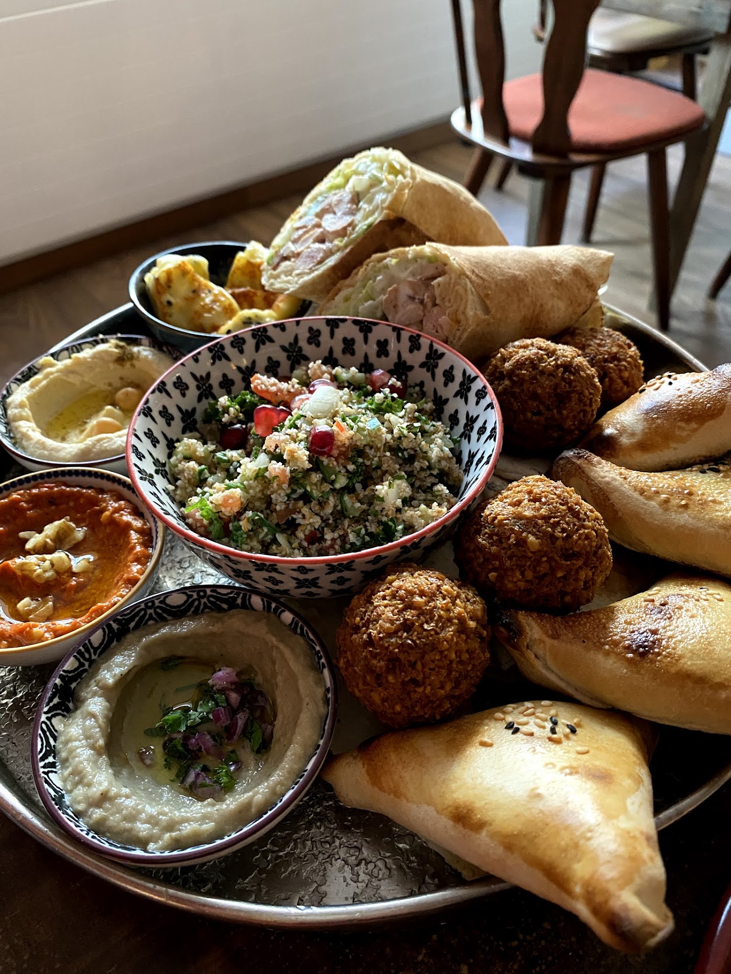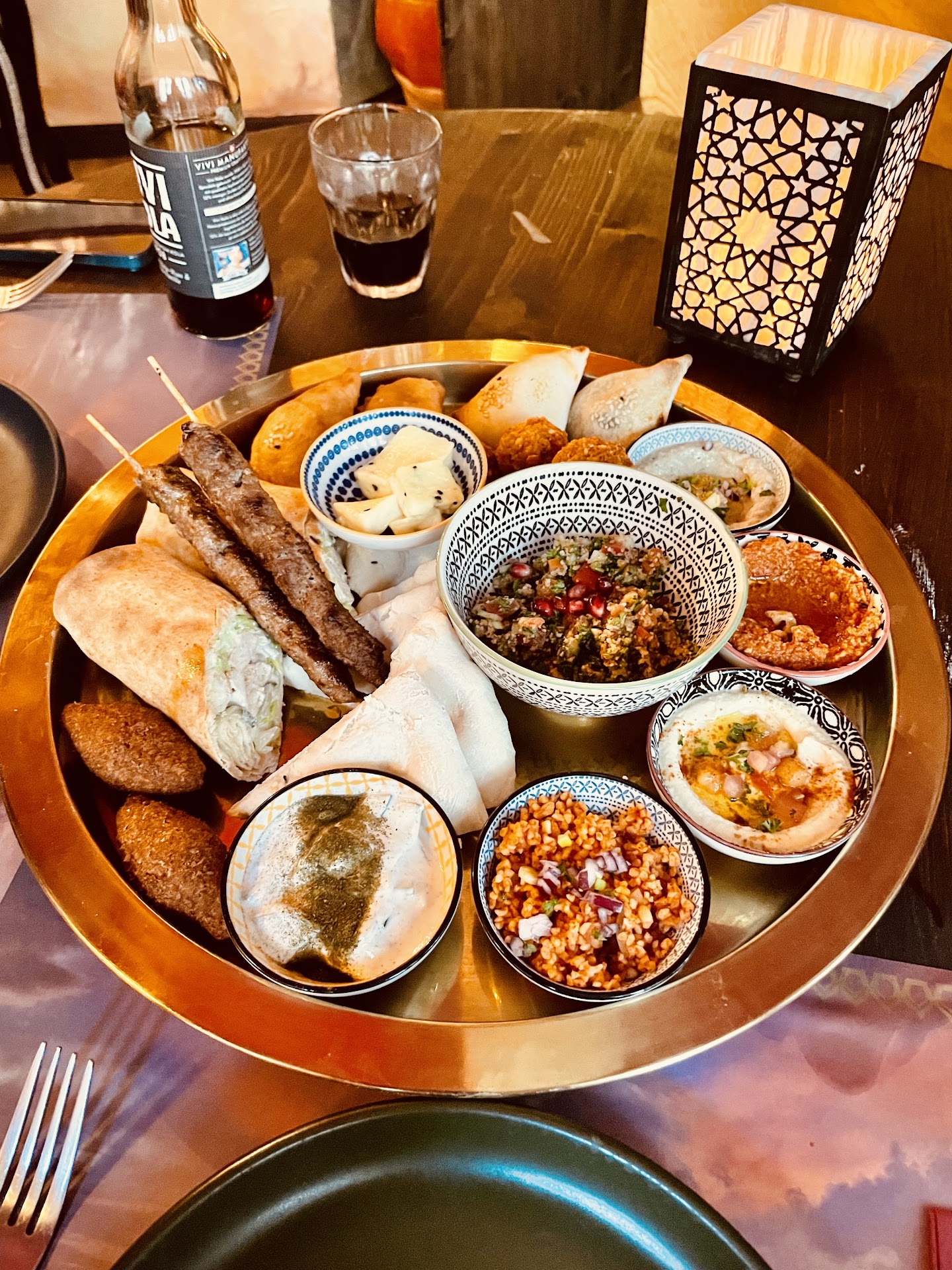 Read moreDie Syrische Platte für 2 war absolut deluxe. Eine Vielflat an Verschiedenem gibt einem einen Einblick in die syrische Küche. Der Hausgemachte Eistee mit imdischen Dattel war extrem lecker und aromatisch. Er hätte noch etwas kälter sein dürfen, um in diesem heissen Wetter die absolute Frische zu erreichen. Die selfmade syrischen Dessert-Häppli waren mit viel Liebe zubereitet und sehr interessant. Wie der nette Kellner bereits im Voraus gesagt hat, waren die Desserts äusserst süss und wahre Kalorienbomben. Eigentlich nicht so mein Geschmack, aber durch die Vorinforrmation und zu einem runden kulturellen Abschluss hats mit dem arrabischen Kaffee ganz gut gepasst. Der Service war äusserst freundlich. Unser Kellner Cyrill strahlt eine absolute Leidenschaft aus und blüht auf in seiner Arbeit. Er wusste sehr genau Bescheid über die einzelnen Häppchen und nahm sich trotz Full House stets Zeit Fragen sehr ausführlich zu beantworten und Wünsche zu berücksichtigen. Ein wahrer Familienbetrieb mit Herzblut! Danke, wir...