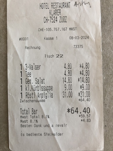Read moreMeiden Sie diesen Ort. Es war der schlimmste Restaurantbesuch meines Lebens (03-2024), dies ohne Übertreibung. Die Suppe ungeniessbar, Rösti und Steinpilze ranzig-fetttriefend, im Eintopf ein langes Haar... die Bedienung war freundlich und hat sich regelrecht geschämt für das Angebot. Bitte schliessen Sie diesen Ort, sie machen allen einen Gefallen.