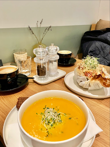 They have great lunch options. We tried the carrot-ginger soup and a baked sweet potato that was to die for. Their sweets are also yummy. Today there was a very tempting waffle with berries. But last time we were here I tried their lemon cake, which was a proper one. Very soft and very lemony.