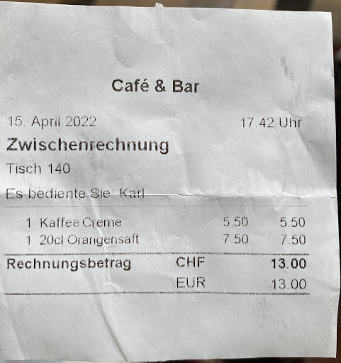 Susanna is unbelievably efficient waitress. Friendly (got us an English menu!), sure, but EFFICIENT. we got cappuccino (dopio) and a latte. They were so good we got two. Susanna was surprised I got two dopios. 😂😂 We ordered eggs, bacon, croissants, and "traditional mountain cheese." In the US, we call it Swiss cheese and I'm telling you I've never had "Swiss cheese" that's in the same category as what we got here. classic old European town vibe, all locals (except us). all topped off with a mid-late 80s US rock playlist including Start Me Up, Private Dancer, Purple Rain, The Time of My Life (Dirty Dancing), and True Colors Zurich all up is a great town and we've been greeted kindly and warmly - in English - everywhere we've gone (folks here learn French and English in school and they speak Swiss German natively). Oh and btw it's shockingly clean!!!