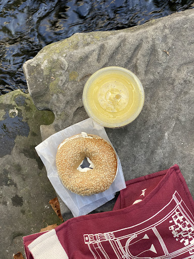 We sat at a small outside table and ordered 2 bagels (a 'Lox Avo' with salmon and an 'Avocado'), a couple different smoothies (Jungle Cure & Pink Fuel) and a cortado coffee. The place had a modern "adapted old brick shop" aesthetic, it was quite full (bordering on cramped), and the slightly hidden location added a good 'curious find' ambiance to it.