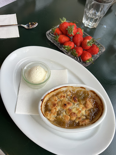 We shared a bottle of Champagne for dinner. We were worried about the temp, but it was served cold and an ice bucket did the rest. Delicious! Dessert included rhubarb crumble with sour cream ice cream (don’t knock it until you’ve tried it, it’s great!), and a plate of fresh strawberries.