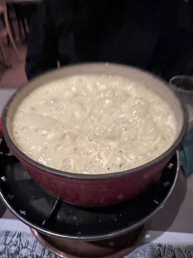 Went with a friend for truffle fondue. Our group was supposed be 4 people, but 2 of us cancelled last minute and it was not a problem. The waiters were friendly, the founde arrived quite fast. Fondue itself was really tasty. We were slightly disappointed with the amount of potatoes that we received, we were hoping to substitute the bread with potatoes but the portion was slightly too small. There was no music playing, which was not a problem for us. The only issue we had was that there was a big group of men dining right next to us. They were extremely loud, sometimes I couldn’t even hear my friend talk, even after asking them to keep it slightly more quiet. The waiter noticed that it bothered us, but they just made a small joke about ‘us wanting to cut their heads off’. It was humorous in the moment, but in the end nothing was done at the extremely loud environment. In retrospective, they could have suggested to move us to a table a bit further away, since we were only 2 and there were still available tables. That is why I leave 4 stars.