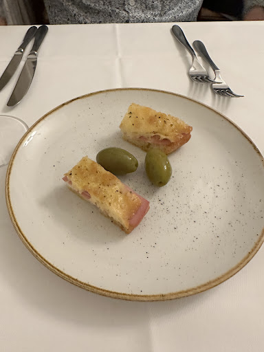 As we sat down, we were asked if we wanted to order an aperitif. We also received an amuse-bouche of focaccia with mortadella and green olives. We were also offered a bread basket, but I quite dislike when there is no bread plate and have to eat off the table cloth.