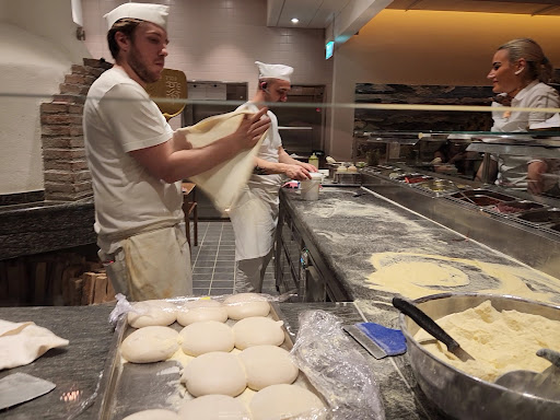 Layout: The restaurant is split into a ground level area and a downstairs area. Both sections were large with lots of tables and seating. We were seated in the downstairs area right next to the pizza oven/station area. It was entertaining to see the pizza area open to all the restaurant and watch the quick and speedy staff churn out delicious food! There is a lovely large spiraling staircase between the two floors with a little kids area beside it!
