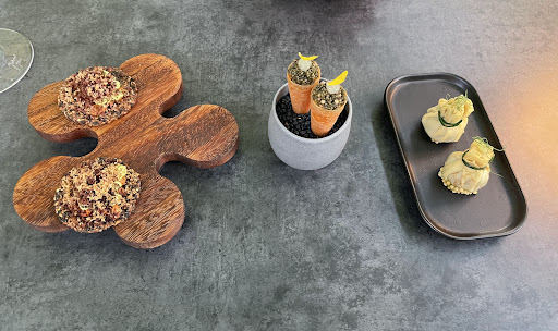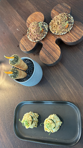 We started with beautiful amuse-bouches, sourdough with celery root cream cheese (I may have fallen in love), and a ring of pickled veg in beurre blanc that made vegetables feel glamorous.