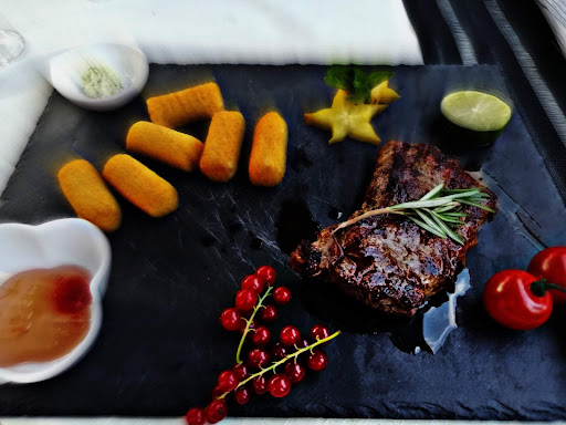 Wir hatten Entrecote, als Beilage gab es einen Salat und Kroketten (man konnte auch Pommes nehmen) unser Sohn hatte eine separate Portion Pommes.
