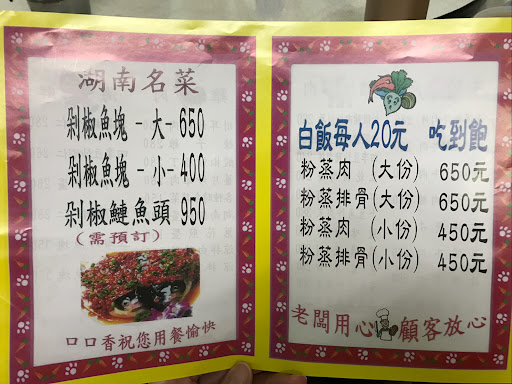 Read more一家算是蠻道地的湘菜餐廳,主打就是下飯,口味上蠻重辣重鹹的,但是真的很適合配飯吃。 卜豆角炒肉末,說是湘菜特定的帶回來的菜,在一般餐廳吃不到。很像酸豆炒肉末,但是不是酸的,吃起來也不是脆脆的,感覺是一種醃菜,搭配豬肉末炒的油香油香的,很不錯下飯。 涼拌白花菜就是白色的花椰菜,吃起來冰冰脆脆的,搭配一點點的四醋酸與辣味,吃起來是清爽但對味的,很像鹽水雞的味道。 臘味合炒好像是當地特色菜,臘肉香腸炒豆干,豆干是用軟軟嫩嫩的那種不是硬硬的蠻好吃的,臘肉有一個臘味獨有的香氣,皮的地方很Q很像橡皮糖,肥肉的地方是微脆脆的口感,香氣很夠,瘦肉的地方口感偏硬但蠻鹹的,很適合配飯。整體來說是個下飯的店,另外,白飯是自己添的,要在多少拿多少。...
