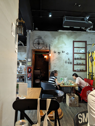 Read more從捷運石牌站過來,步行約8分鐘。 由於在巷子裡,路線又多條,我認為這樣走法比較順:走石牌二路,到裕民一路,右轉,逕直往前,過夜市,看到統一超商牆上書寫「333巷」,續行數十步,就是目的地了。 店門頗寬,兩邊放了綠色盆栽、聖誕紅、沙發椅;屋檐垂下雪花形、長條形燈飾,夜幕低垂時,閃出白色、藍色亮光,十分引人注意。 室內長、寬、深,進門左側是大櫃台、房間;右邊是客座、洗手間。 裝潢、物件都極有特色:造型別致奇妙一一矮長桌底部裝著兩個小輪、沙發椅兩旁長得像大車輪、石雕嘴裏抽得出紙巾;圖畫虛實參半一一畫裏兒童騎真的腳踏車、圖中小孩踮腳伸手搆真的咖啡杯、畫中教堂外掛的真鐘如常行走;異國氣氛充斥一一輕柔慵懶的美國音樂迴盪耳邊、美國66號公路/荷蘭風車/跑車抱枕讓我們倚靠、一面牆壁畫著大幅英國國旗仿若身置英國、一面牆壁畫上倫敦大橋壯觀景象令人驚艷不已;器具復古懷舊一一模樣簡樸光線昏黃的煤油燈式燈具、1987年出現的田宮遙控怪獸卡車模型;文字浪漫有趣一一雙人座牆上,寫著「我想和你見個麵/吃燉飯/親親嘴/喝咖啡」,坐在這些圖文下面,情意大概會綿綿而出了。 餐飲供應沙拉、炸物、早午餐、醬炒鴨胸義大利麵、風塵女辣嗆炭烤墨魚義大利麵、滿載到港生食級干貝海鮮燉飯、黑松露野菇豬小排燉飯、手工烤餅、泰式海鮮飯、香酥雞翅飯、照燒無骨雞腿排飯、紅酒燉牛肉飯、巴薩米克醋鴨胸飯、低溫雞胸肉飯、義式咖啡、紅茶、可樂、鮮奶、果汁、水果茶、漢方養氣茶、氣泡飲……。 我點了早午餐中的「挪威森林的開放煙燻鮭魚三明治套餐」,煙燻鮭魚幾片,不多;法國麵包三片,烤得酥脆;黑松露蛋沙拉量頗多、味道也好,另有玉米濃湯、自製沙拉醬、油醋沙拉。整體來說:我覺得份量不夠豐沛,飽足感差一點。 加199元,升級為套餐,飲品在100元以內,可以補差價換成它款,甜點則任選。飲料,我點了「焦糖海鹽拿鐵」,補上差價;甜點,選了「不混鮮奶油的提拉米蘇」,口感都還好。 工作人員都溫婉可親,有時正逢他們在用餐,可能要等個片刻或半小時。 營業時間10:30~20:00、能坐到9:30、有WIFI、牆上有插座、提供置物籃、採半自助式、低消150、10歲以上須符合低消規定、尖峰時段用餐120分鐘、收現金...