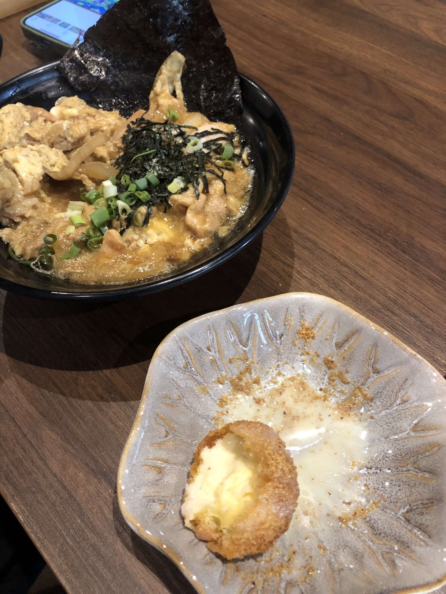 這店4.8顆星(113/11/12)是洗出來的吧? 先說服務 不三不四!進店後,店內沒有任何客人,店員只過來跟我們告知點餐掃QR code後,就走了。 至於店內免費招待的湯、飲料、冰淇淋可以自取都沒說,餐具要自取也沒說。都要我們自己去詢問才跟我們說可以自取。是什麼湯也不說。 點餐中的套餐內容都要一個一個點進去才看得到,詢問店員也是問一個答一個,像機器人一樣。 餐點 我們點了親子丼、起司炸豬排丼和一個炸泡芙。炸泡芙就不說了,根本是炸冰淇淋球,和泡芙一丁點關係都沒有。 炸豬排丼的配菜玉米筍用的是罐頭玉米筍,有夠難吃,擺盤的生菜葉是開始泛黃的老葉,豬排炸得硬又老。 最糟糕就是雞肉親子丼,一上菜就聞到雞腥味,那些雞肉一部分沒什麼雞腥味,一部分味道濃得令人反胃,有夠糟糕噁心!丼飯的醬汁也不香,味道水水的。這種等級的醬汁的親子丼賣個8、90元還差不多,重點是那雞肉根本不應該出給客人,廚師做菜都沒有聞過新不新鮮嗎?⋯ 整間店還令人滿意的就是那個雞湯。 那個巧克力冰淇淋也難吃,就像廉價硬幣巧克力味道那樣! 真是個糟糕的用餐體驗!